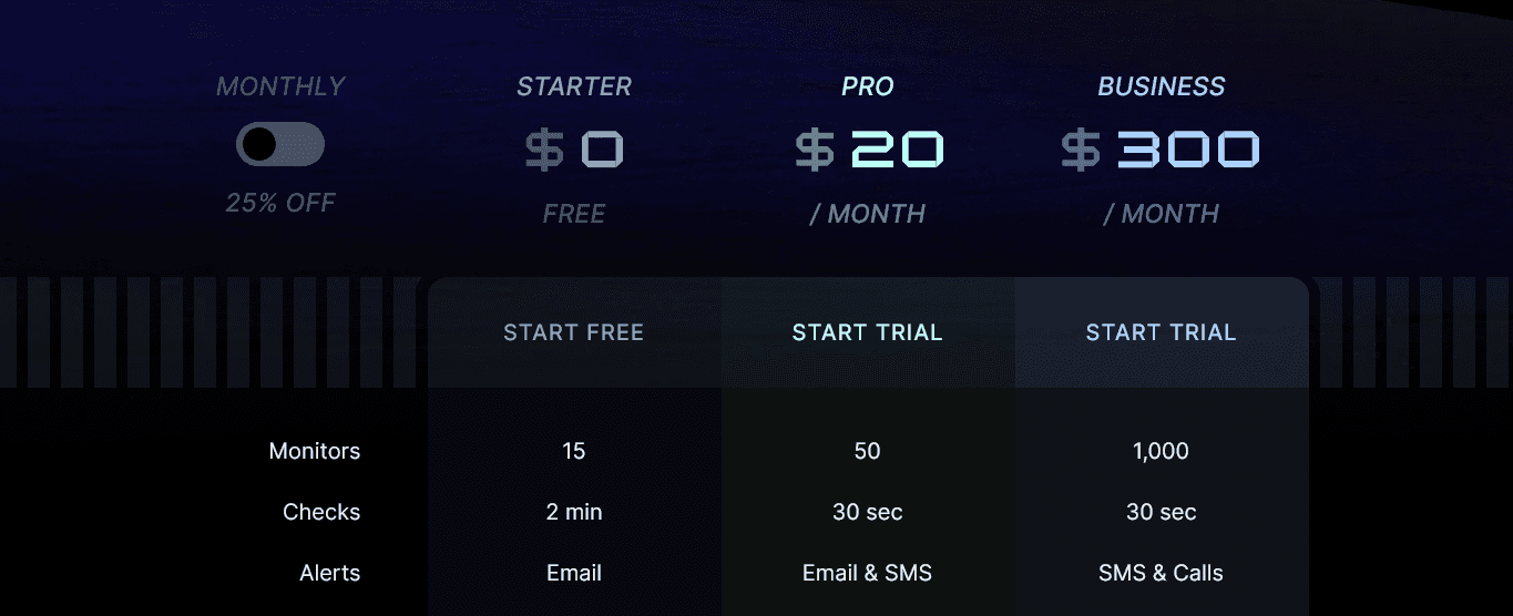 - Business Plan (from $300/month): 1,000 monitors, 30-second intervals, SMS and phone call alerts, SAML SSO, all status page types, support for 25,000 subscribers, and 50 on-call members.