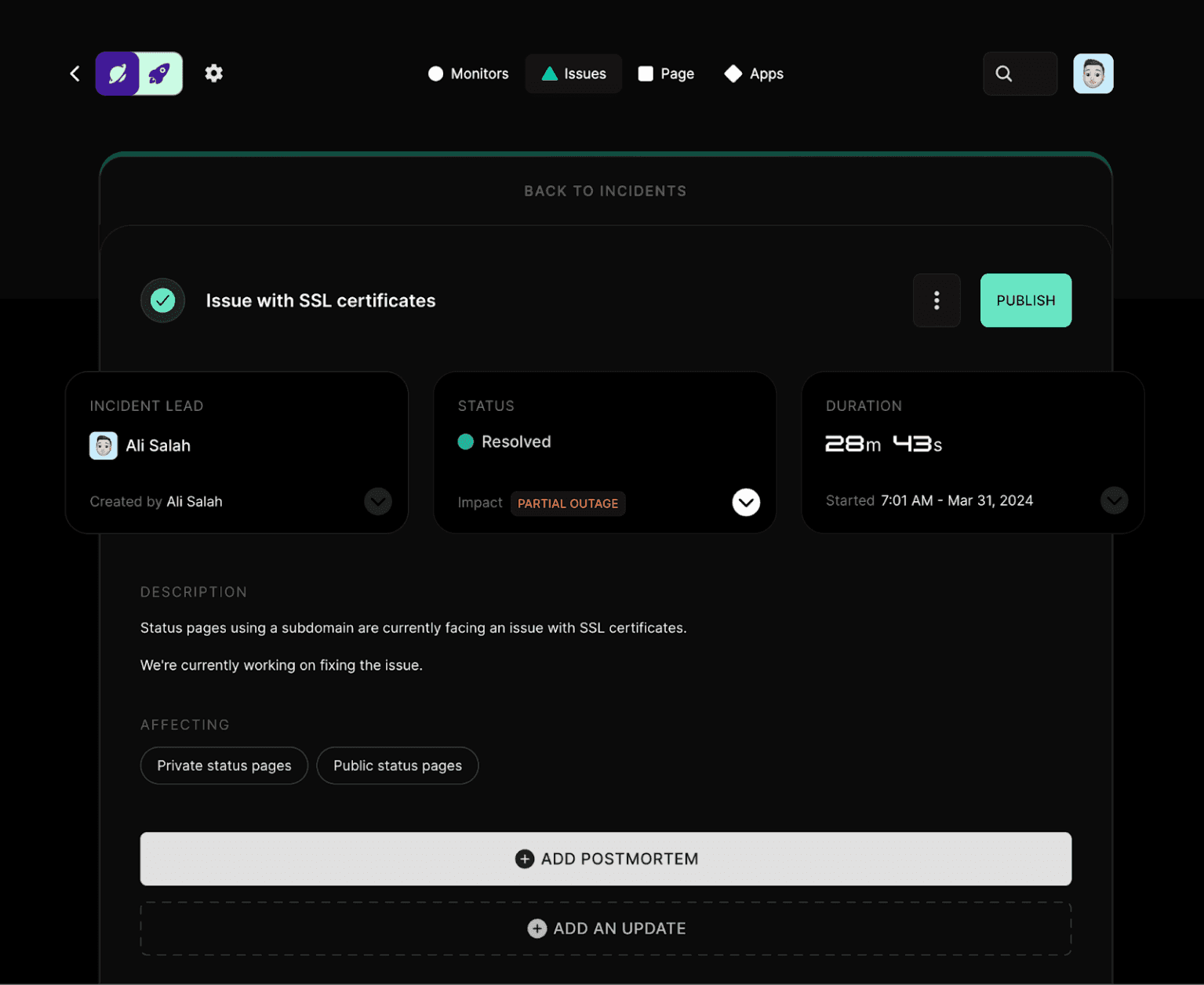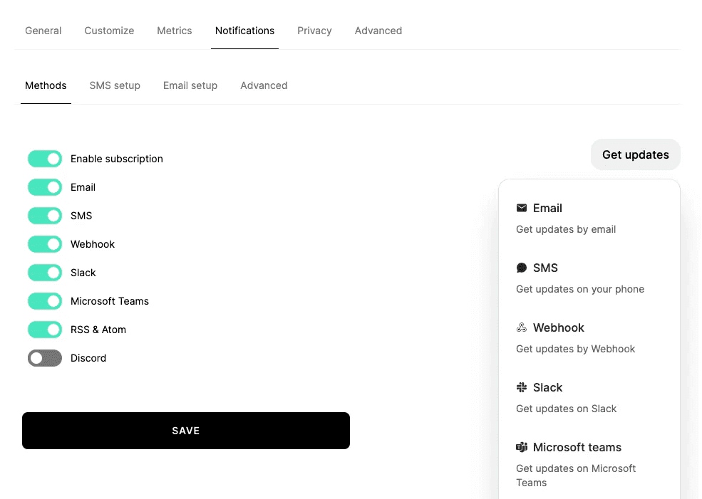 Instatus, for instance, ensures you stay informed and responsive by offering a comprehensive alerts and notifications feature. Receive timely updates about system issues through diverse channels such as emails, SMSs, and calls.