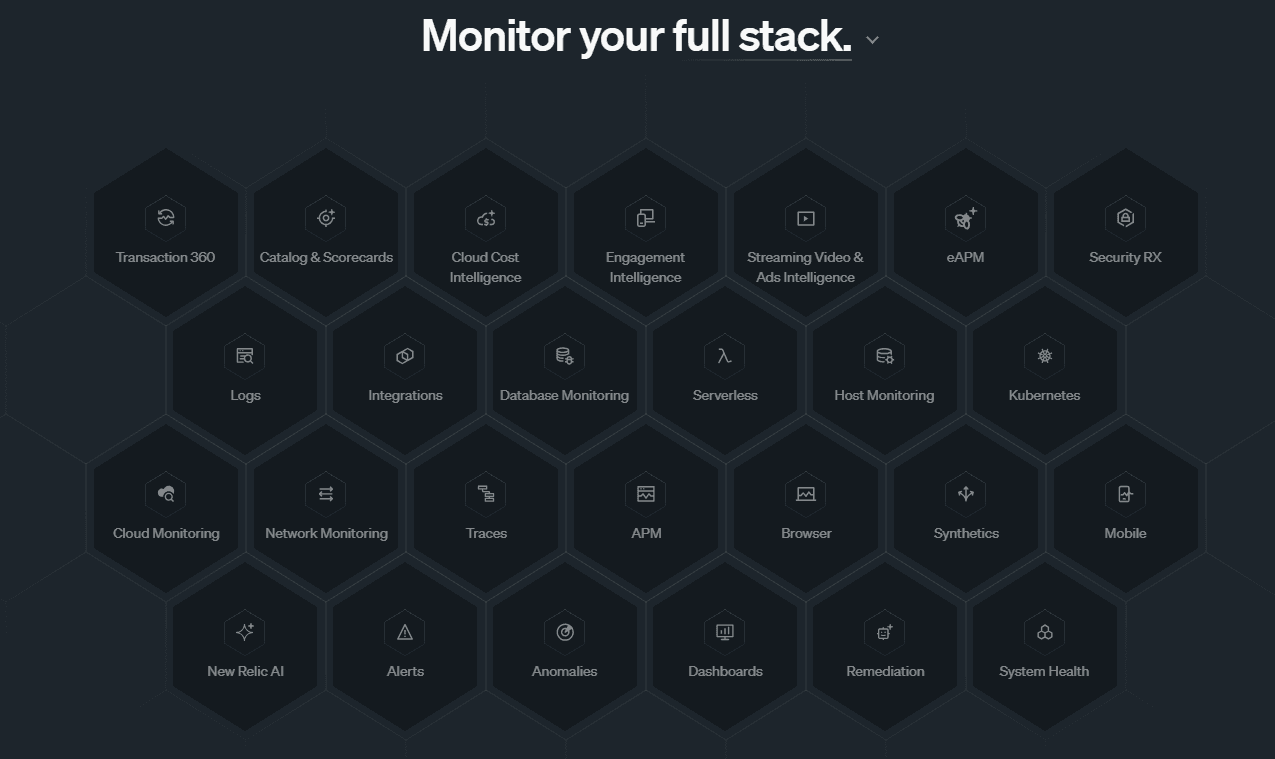 New Relic stands as an all-in-one observability platform, offering over 50 capabilities and seamlessly integrating with over 700 tools to provide AI-powered insights and eliminate silos in data, tools, and teams. The New Relic Platform delivers full-stack observability across your enterprise, empowering you to predict and detect issues proactively before they impact customers.