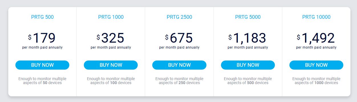 | PRTG | Windows environments | On-premise/Cloud | $8,099/year | 100 sensors | 1-2 hours |