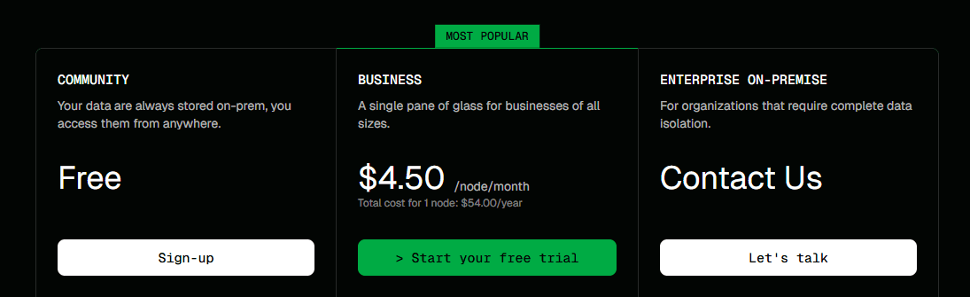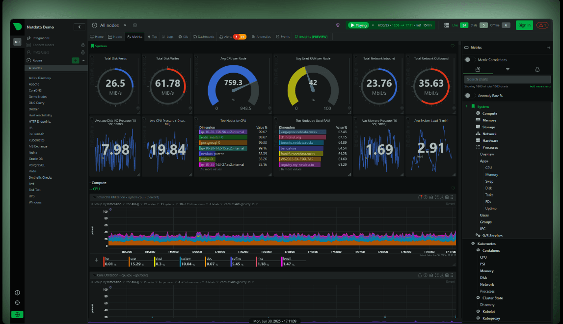 | Netdata | Real-time metrics | Self-hosted/Cloud | $4.50/node/mo | 5 nodes free | 15 minutes |