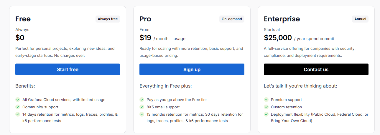 | Grafana Cloud | Visualization & alerts | SaaS | $19/mo + usage | 10K series | 1 hour |