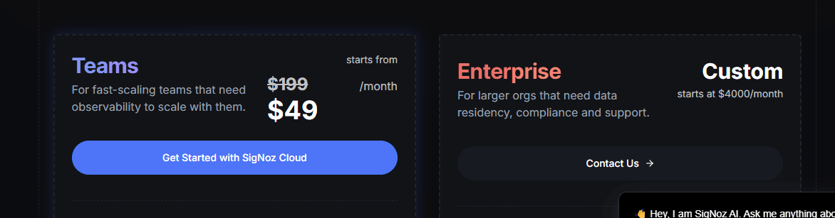 | SigNoz | OpenTelemetry | Self-hosted/Cloud | $49/mo | Yes | 2-4 hours |