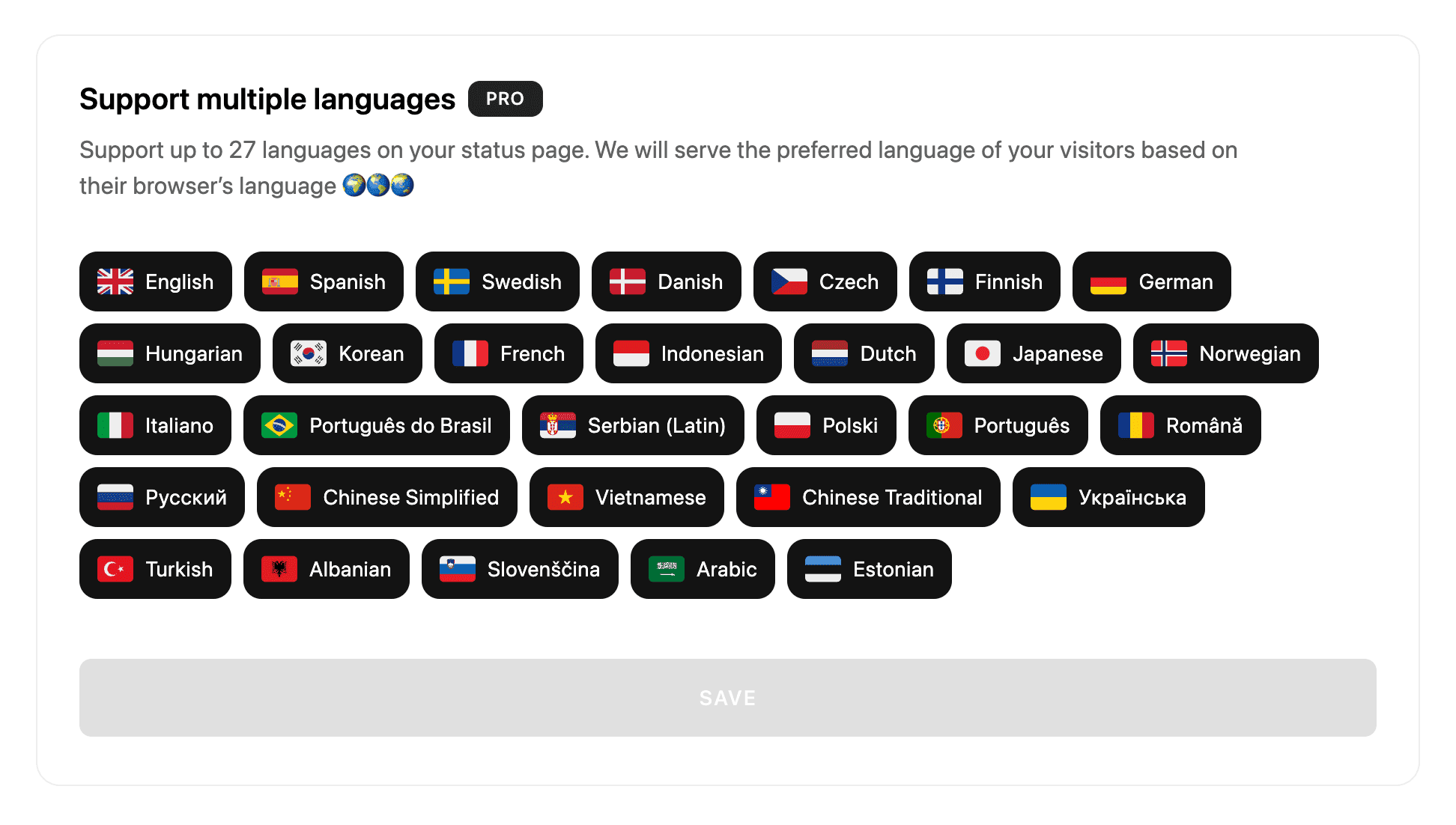 Instatus offers users a status page in their native language with over 21+ languages supported. This ensures that users of different languages can use the network solution seamlessly.