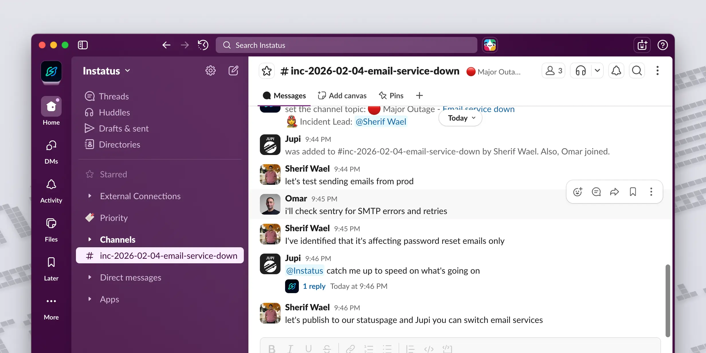 Slack-native incident response: Manage your incident lifecycle directly from Slack.